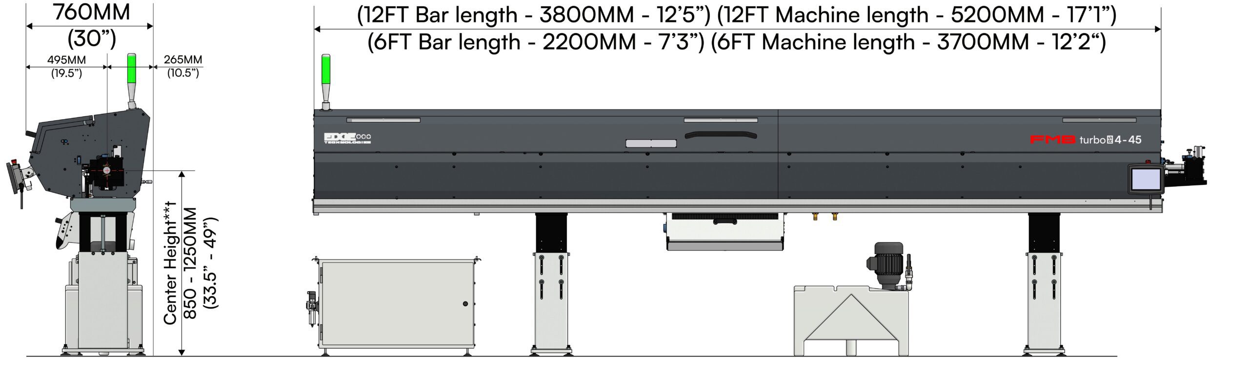 The FMB Turbo RS 4-45 A (Auto-Adjust) is a magazine style automatic bar feeder for processing bars in the diameter ranges of 5-65mm and in lengths from 12’ to 14’ on CNC lathes. Auto adjusting polyurethane guide channels allow for quiet operation at high RPM while feeding round, square or hex bar stock.